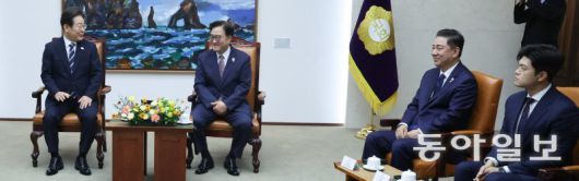 이재명 대통령이 26일 국회 추가경정예산안 시정연설에 앞서 우원식 국회의장과 더불어민주당 김병기 당대표 직무대행 겸 원내대표, 국민의힘 김용태 비상대책위원장(왼쪽부터) 등 여야 지도부와 사전 환담을 하고 있다. 송은석 기자 silverstone@donga.com |