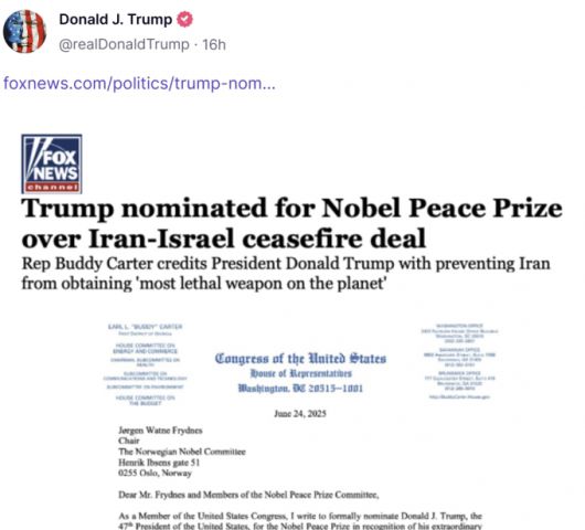 도널드 트럼프 미국 대통령이 다시 노벨평화상의 문을 두드린다. 이번엔 중동의 오랜 앙숙인 이란과 이스라엘 사이에서 휴전을 성사시켰다는 이유에서다. 집권 1기 때도 한반도와 중동의 평화 중재 노력으로 노벨평화상을 노렸던 그다. 버디 카터 공화당 하원의원은 이스라엘과 이란 휴전 후 기다렸다는 듯 트럼프를 노벨평화상 후보로 추천했다.