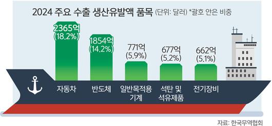 분야별로 자동차산업 수출의 생산유발액은 2365억달러로 가장 많은 비중(전체의 18.2%)을 차지했다. 자동차산업 생산유발액은 2021년 1708억달러로 반도체(1786억달러)에 못 미쳤지만 이후 3년 연속 1위를 차지했다.