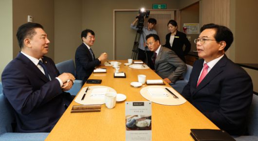 ▲더불어민주당 김병기 더불어민주당 원내대표(왼쪽)와 국민의힘 송언석 원내대표가 26일 서울 여의도 한 식당에서 열린 양당 오찬 회동에서 대화를 나누고 있다. ⓒ연합뉴스 |