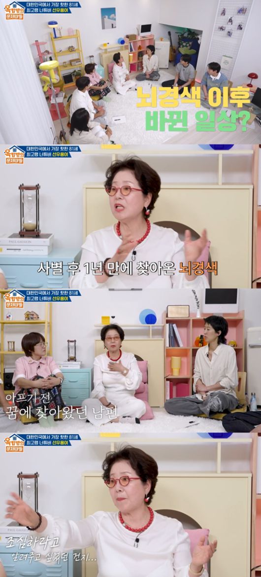 선우용여는 "전에는 아무거나 먹어도 되는 줄 알았다. 남편이 돌아가시고 1년 만에 뇌경색에 걸렸다. 뇌경색 오기 전에 남편이 꿈에 보였다. 하얀 옷을 입고 나타나더니 가버렸다"라며 기억을 회상했다.