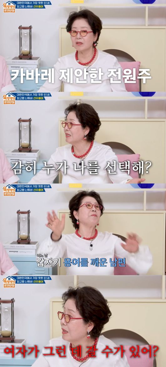 선우용여는 "자다가 일어나서 남편 멱살을 잡고 '내가 거기 못 가라는 법이 어딨냐. 내가 자존심 상해서 말을 안 했는데'라고 했다. 아침에 보니 남편의 목에 멍이 들었다. 그다음부터 어디 갔다 왔는지 안 물어봤다"라고 말했다.