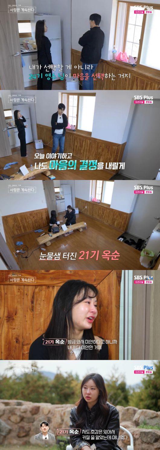 26일 방송된 SBS Plus·ENA '나는 SOLO, 그 후 사랑은 계속된다(나솔사계)'에는 21기 옥순이 24기 영수의 이야기를 들은 후 눈물을 흘리는 모습이 그려졌다.