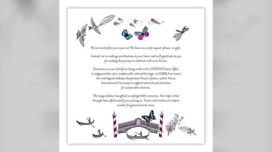 하객들에게 결혼 선물을 사양한다고 밝히면서, 베네치아 유산 보호와 환경 단체 지원을 위한 기부를 요청했습니다.