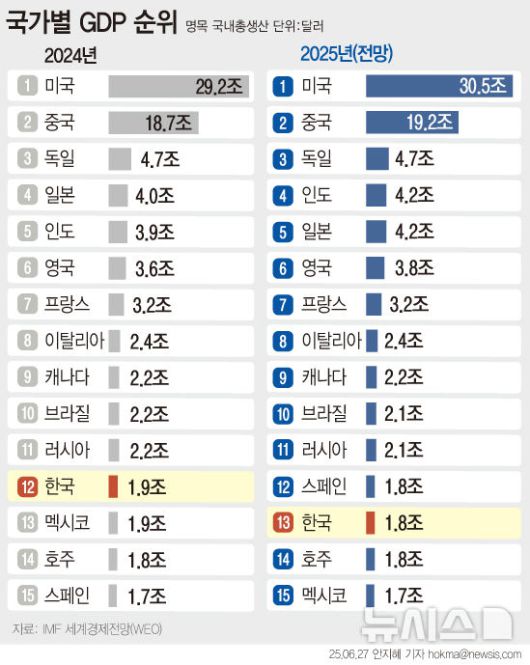 27일 국제통화기금(IMF)의 세계경제전망(WEO)에 따르면 우리나라의 명목 GDP(달러 기준) 규모는 2024년 1조8697억 달러에서 올해 1조7903억 달러로 감소하고, 순위는 12위에서 13위로 떨어질 것으로 전망된다.