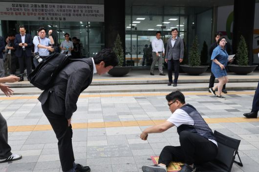 고용노동부 장관 후보자로 지명된 김영훈 전 민주노총 위원장이 6월24일 오후 청문회 준비 사무실이 마련된 서울 중구 장교빌딩으로 출근하며 건물 들머리에서 노숙 농성 중인 김정봉 금속노조 동부지역지회 부지회장에게 인사를 건네고 있다. 한겨레 김혜윤 기자 unique@hani.co.kr |