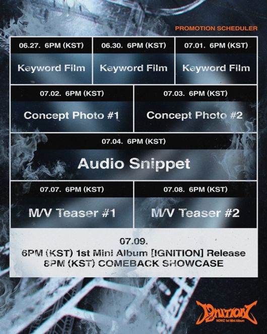 큐브엔터테인먼트는 지난 26일 공식 채널에 나우즈(현빈, 윤, 연우, 진혁, 시윤) 첫 미니 앨범 'IGNITION'의 프로모션 스케줄러를 공개했다. 강렬한 분위기의 스케줄러는 앞서 푸르른 청춘 감성을 담은 선공개곡 '자유롭게 날아 (Feat. 우기 (YUQI))'와 또 다른 콘셉트를 예고했다.