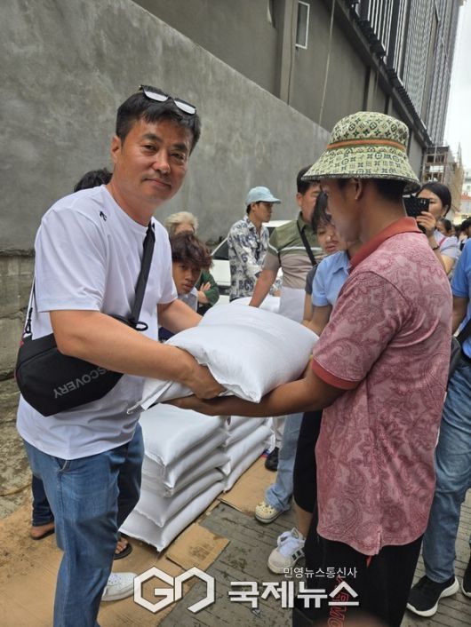 경주외동라이온스클럽 이상일 전 회장이 (사)한아세안경제문화교류협회 & ASII와 함께 캄보디아서 사랑의 쌀나눔 봉사를 진행하고 있다(사진=(사)한아세안경제문화교류협회) |