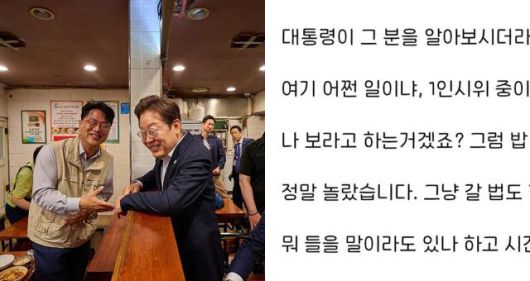 이재명 대통령이 국회 시정연설 후 용산 대통령실 앞 '골목 상권'에 있는 식당을 방문해 점심 식사를 한 것과 관련 당시 해당 식당에 있었던 누리꾼의 게시글이 공개됐다.
