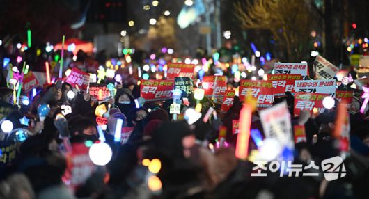 13일 오후 서울 영등포구 산업은행 본점 앞에서 열린 '내란수괴 윤석열 즉각 탄핵! 즉각 체포! 탄핵촛불문화제' 에서 시민들이 응원봉을 흔들며 구호를 외치고 있다. [사진=곽영래 기자] |