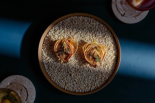 일본메추라기 배양육에 헤이즐넛 비스킷 등을 곁들이고 양파 크리스프를 얹은 파르페. 바우 제공 |