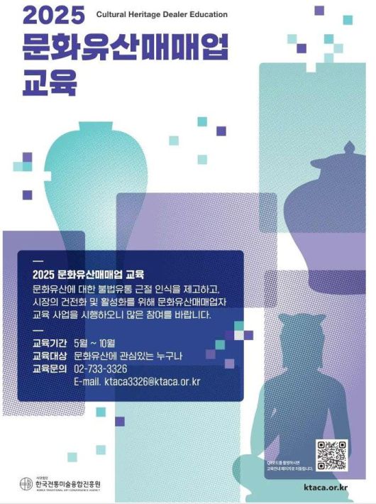 국가유산청은 (사)한국전통미술융합진흥원과 오는 10월까지 경기, 영남, 호남, 충청지역 등에서 전국 문화유산매매업자와 창업 준비자를 대상으로 '2025년도 문화유산매매업자 교육'을 실시한다고 27일 밝혔다.