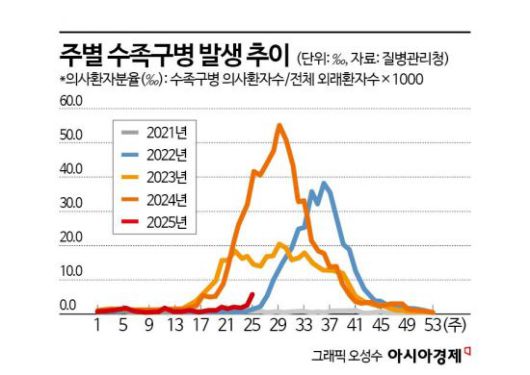 질병청은 수족구병이 매년 5월부터 본격적으로 증가해 6~9월 사이에 많이 발생하는 특성을 고려할 때 당분간 환자 발생이 증가할 것으로 예상했다.