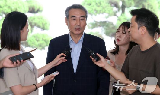 윤석열 전 대통령의 부인 김건희 여사 의혹 관련 사건 수사를 맡은 민중기 특별검사가 27일 오전 서울 서초구 사무실로 출근하며 취재진의 질의에 답변하고 있다. 2025.6.27/뉴스1 ⓒ News1 김명섭 기자 |