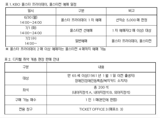 또한, 올스타 프라이데이와 올스타전 당일에는 디지털 취약 계층을 위한 현장 판매가 실시된다. 만 65세 이상(1961년 1월 1일 이전 출생자)과 장애인(장애인등록증/복지카드 소지자)은 1인 1매 구매가 가능하다. 구매 가능한 좌석 구역은 내야지정석A, 내야지정석B, 외야지정석이며 티켓은 매표소 3에서 구매할 수 있다.