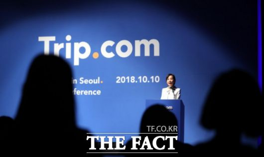 중국계 여행 플랫폼이 막대한 자본을 배경으로 국내 영향력을 키우는 가운데 국내 토종 플랫폼들이 촉각을 곤두세우고 있다. 사진은 지난 2018년 한국에서 발표하고 있는 제인 순 트립닷컴 CEO 모습 /뉴시스 |