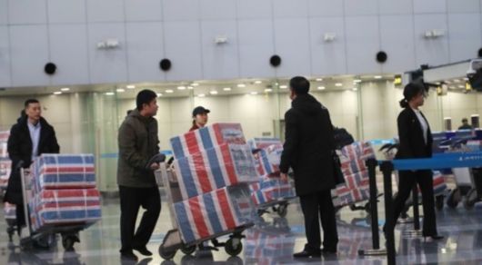2019년 베이징 공항에서 귀국길에 오르는 북한 노동자 추정 일행. [연합] |