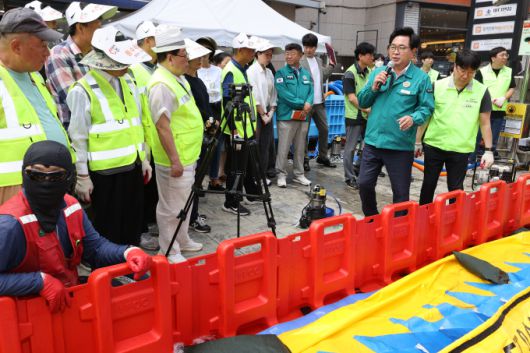 27일 동작구에 따르면 구는 장마 시작을 앞둔 지난 18일 성대전통시장에서 '집중호우 대비 수방장비 교육·훈련'을 실시하며 수방 대책을 본격적으로 가동했다. 이날 훈련에는 지역주민과 상인 등 50여 명이 참석한 가운데 박일하 구청장이 직접 상황별 행동 요령과 장비 사용법 등을 설명하고, '빗물받이 관리자'의 역할을 강조했다.