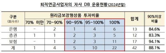 DB형 수익률이 저조한 건 퇴직연금사업자인 금융회사들도 마찬가지였다. 금감원이 DB 제도를 운영하고 있는 총 42개 퇴직연금사업자의 자체 DB 적립금 운용 현황을 분석한 결과 전체 사업자의 88.1%에 해당하는 37개사가 적립금의 90% 이상을 원리금보장형으로 운용하고 있었다.