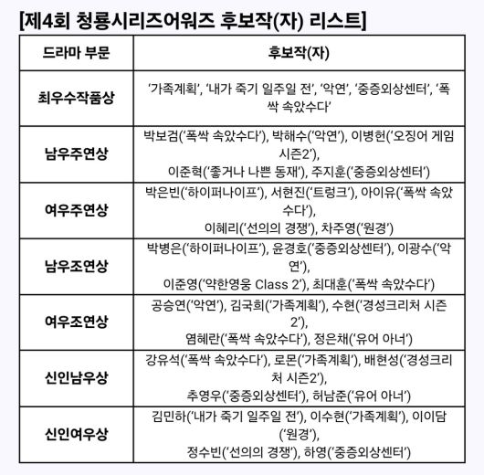 매년 박빙의 승부로 화제를 모은 청룡시리즈어워즈인 만큼 올해 역시 쟁쟁한 후보들이 경쟁에 나섰다. 드라마 부문 최우수작품상 후보로는 ‘가족계획’, ‘내가 죽기 일주일 전’, ‘악연’, ‘중증외상센터’, ‘폭싹 속았수다’(작품명 가나다 순)가 이름을 올렸다.