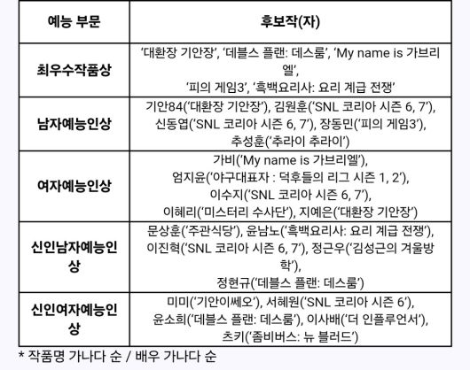 지난 1년간 시청자들에게 유쾌한 웃음을 선사하며 화제를 모은 작품을 가리는 예능 부문 최우수작품상 후보에는 ‘대환장 기안장’, ‘데블스 플랜: 데스룸’, ‘My name is 가브리엘’, ‘피의 게임3’, ‘흑백요리사: 요리 계급 전쟁’이 올랐다. 대중성과 화제성을 동시에 잡은 작품들이 뜨거운 접전을 벌일 것으로 보인다.