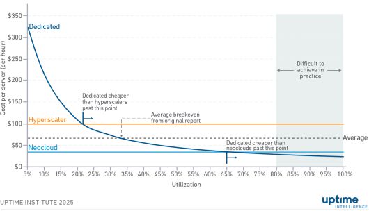하지만 네오클라우드보다 더 많은 비용을 절감하려면 활용률을 66%까지 끌어올려야 한다. 업타임은 “활용률 66%를 넘기려면 AI 워크로드 배치 효율이 매우 높아야 하므로 대부분 기업에는 어려운 수준”이라며, “이 같은 상황에서는 전용 인프라를 직접 구축하는 것보다 네오클라우드를 이용하는 편이 비용 면에서 유리하다”라고 분석했다.