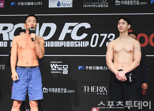 [스포츠투데이 팽현준 기자] 27일 서울 홍은동 스위스 그랜드 호텔에서 열린 로드FC 073 계체량에서 스페셜 이벤트 매치 윤형빈과 밴쯔가 소감을 말하고 있다. 2025.06.27. [스포츠투데이 팽현준 기자 sports@stoo.com]