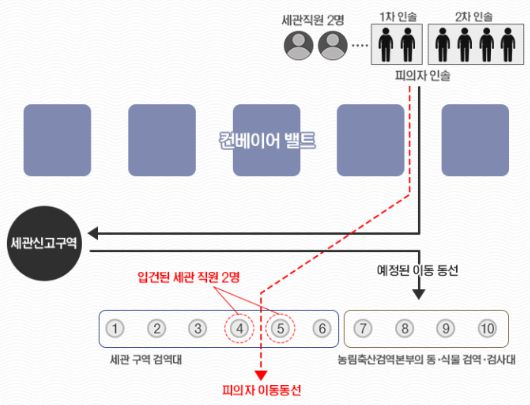 서울 영등포경찰서는 이날 인천공항세관 직원 4명에 대해 입건 전 조사에 착수했다고 밝혔다. 이들은 지난 1월 필로폰 24kg를 밀반입한 말레이시아인 마약 조직원들이 보안검색을 피할 수 있도록 도운 혐의를 받고 있다. 당시 조직원들은 필로폰을 4~6kg씩 나눠 옷과 신체 등에 숨긴 채 입국했으며 지난 2월에도 김해공항에서 같은 수법으로 마약을 밀반입한 것으로 진술했다. 조직원들이 국내에 들여온 필로폰 양은 74kg에 달하며, 이는 약 246만 명이 동시 투약할 수 있는 양이다. 이들 직원은 21일 마약류 관리법 위반, 특정범죄가중처벌등에관한법률 위반, 위계에 의한 공무집행 방해 등의 혐의로 입건됐다.