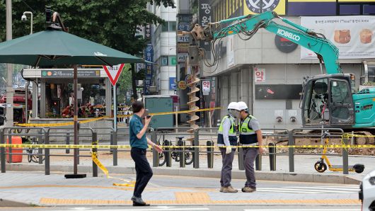 ▲ 27일 오전 10시 47분께 서울 서초구 지하철 2호선 교대역의 11번 출구 인근에서 공사현장 굴착기가 도시가스 배관을 뚫는 사고가 발생해 일대가 통제되고 있다.