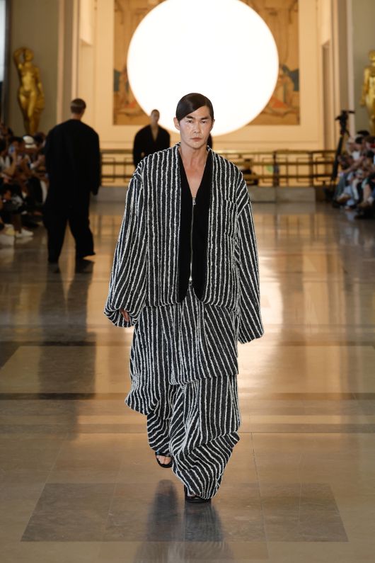 특히 이날 그는 흑백 스트라이프의 오버사이즈 실루엣과 강렬한 레드 톤의 풀셋업 스타일을 소화하며, 클래식과 미래적 감각이 공존하는 송지오만의 '오리엔탈 퓨처리즘'의 미학을 완벽히 체화했다. 실험적인 룩을 자신만의 스타일로 재해석한 배정남은 전통과 혁신, 감성과 구조를 동시에 담아낸 무대를 선보였다.