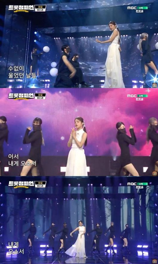 정다경은 26일 방송된 MBC ON '트롯챔피언'에 출연해 신곡 '마중'을 선보였다. 이날 한국적인 멋을 살린 화이트 톤의 의상을 입고 우아함을 뽐낸 정다경은 애틋하면서도 부드러운 보이스와 시적인 감성을 자신만의 색으로 소화하며 트로트 팬들에게 깊은 여운을 남겼다.