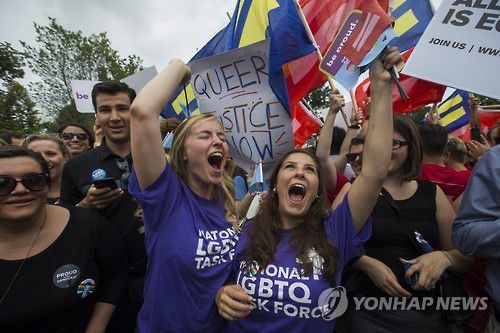2015년 6월 미국 연방대법원의 동성혼 합법화 결정 이후 환호하고 있는 지지자들 [EPA 연합뉴스 자료사진. 재판매 및 DB 금지] |