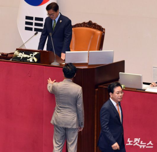 27일 서울 여의도 국회에서 열린 제426회국회(임시회) 제3차 본회의에서 국민의힘 송언석 원내대표와 유상범 원내수석부대표가 민주당 주도의 상임위원장 선출에 반발하며 우원식 국회의장에게 항의하고 퇴장하고 있다.