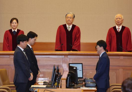 27일 서울 종로구 헌법재판소 대심판정에서 재판관들이 6월 심판사건 선고를 위해 입장하고 있다. 연합뉴스 |