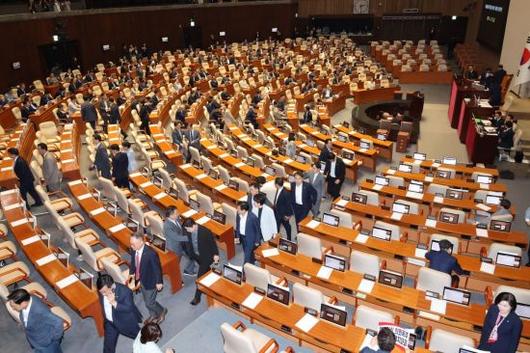 국민의힘 의원들이 27일 국회 본회의에서 여당 주도의 법제사법위원장 등 상임위원장 선출에 반대하며 퇴장하고 있다. 연합뉴스 |