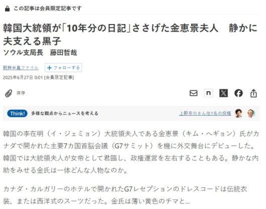 일본 니혼게이자이신문(닛케이)은 27일 "이재명 대통령의 부인 김혜경 여사가 캐나다에서 열린 G7 정상회의를 계기로 외교 무대에 데뷔했다"고 서울지국장 후지타 테츠야의 기사를 보도했다. 해당 기사는 유료 기사로, 닛케이를 구독한 회원들만 볼 수 있다.