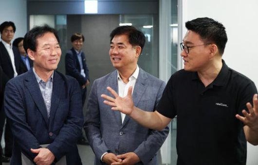 정태호 국정기획위원회 경제1분과장과 위원들이 25일 경기도 성남시 분당구 AI 반도체 설계 스타트업 리벨리온을 방문, 박성현 리벨리온 대표로부터 제품에 대한 설명을 듣고 있다. 연합뉴스 |