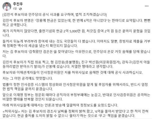 주 의원은 "인사검증을 방해할 목적으로 허위사실을 유포한 민주당 인사는 형사 고소하겠다"며 "과도하고 악의적인 방송과 댓글도 선별 고소하겠다"고 예고했다.