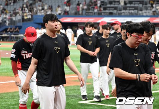 [OSEN=고척, 이대선 기자] 프로야구 키움 히어로즈와 KIA 타이거즈가 무승부를 기록했다. 키움과 KIA는 26일 서울 고척 스카이돔에서 열린 2025 KBO리그 시즌 12차전 맞대결에서 연장 11회 5-5 무승부를 기록했다. 경기 종료 후 KIA 선수들이 그라운드를 나가고 있다. 2025.06.26 /sunday@osen.co.kr |