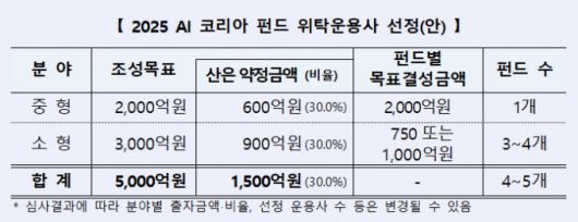 산업은행의 이번 출자사업은 3년간(2024~2026년) 총 1조5000억원 규모로 조성 중인 'AI 코리아 펀드' 출자사업의 2차년도 사업이다. 산업은행 출자금 1500억원을 활용해 중형 분야(2000억원), 소형 분야(3000억원) 등 총 5000억원 규모의 펀드가 조성될 예정이다.