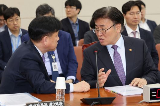 유상임 과학기술정보통신부 장관(오른쪽)이 서울 여의도 국회에서 열린 과학기술정보방송통신위원회 전체회의에서 강도현 과기부 2차관과 대화하고 있다. /사진=뉴시스 |