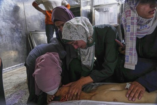 26일(현지시간) 가자지구의 시파 병원에서 이스라엘군 공습으로 숨진 남성의 시신을 놓고 유족들이 슬퍼하고 있다. AP·연합뉴스 |