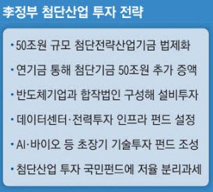 핵심 내용은 현재 추진 중인 50조원 규모 첨단전략산업기금을 조성하고 연·기금과 민간자금을 통해 이를 100조원까지 증액한 후 △바이오 등 초장기 기술투자펀드 △인공지능(AI) 등 첨단산업 인프라스트럭처 펀드 △반도체 설비 직접투자 △국민참여펀드에 분산 지원하는 방안이다.