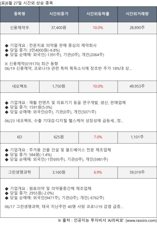 [서울=뉴스핌] 로보뉴스 = 6월 27일, 인공지능 투자비서 ‘AI라씨로’는 시간외 단일가 매매에서 크게 상승한 신풍제약우(019175), 네오펙트(290660) 등에 대해 최근 동향을 분석했다.