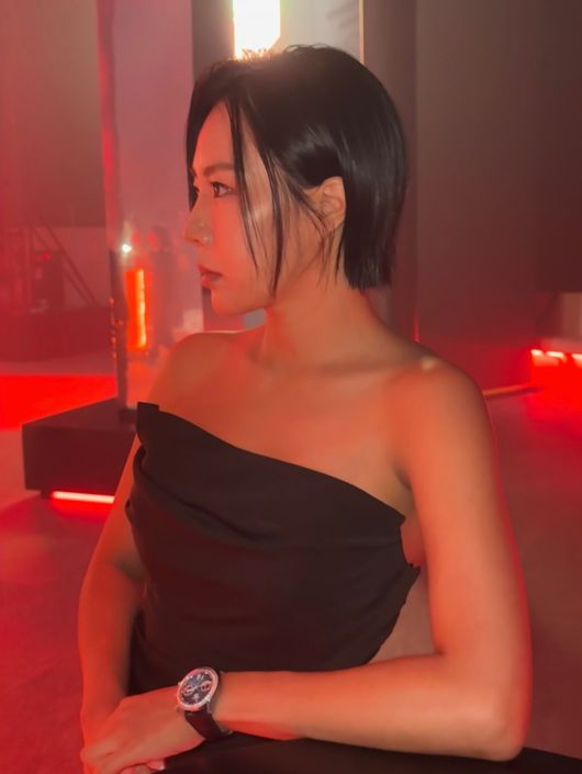 사진 속 이상화는 붉은 조명 아래 고혹적인 눈빛을 드러내며, 올블랙 드레스를 입고 탄탄한 실루엣을 뽐냈다. 짧은 헤어스타일과 여리한 어깨 라인, 날렵한 턱선이 어우러져 우아하면서도 강인한 분위기를 자아낸다.
