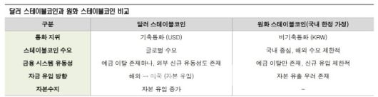 이같은 금융시스템의 구조적 차이와 비기축국 통화에 대한 낮은 글로벌 수요는 원화 스테이블코인의 유통 확대와 수익 확장성을 구조적으로 제약할 것이란 진단이다.