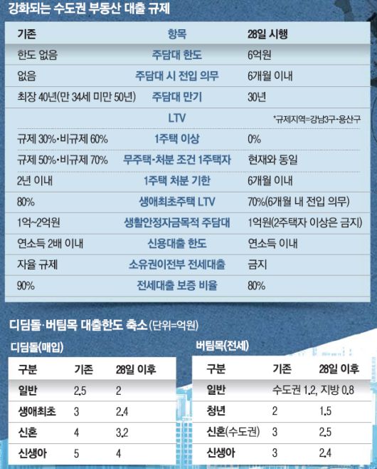 수도권과 규제지역에서 28일부터 주택담보대출이 6억원으로 제한된다. 주택가격이나 연소득에 상관없이 주택담보대출 상한을 설정하는 것은 이번이 처음이다.