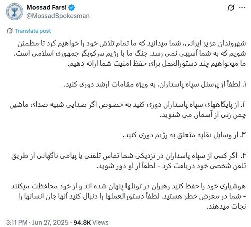 모사드는 "우리의 전쟁은 이슬람공화국의 압제적인 정권에 대한 것"이라며 "경계하라, 지도자들은 땅굴에 숨어 자신을 보호하고 있지만 여러분은 위험해 처해 있다"고 덧붙였다.