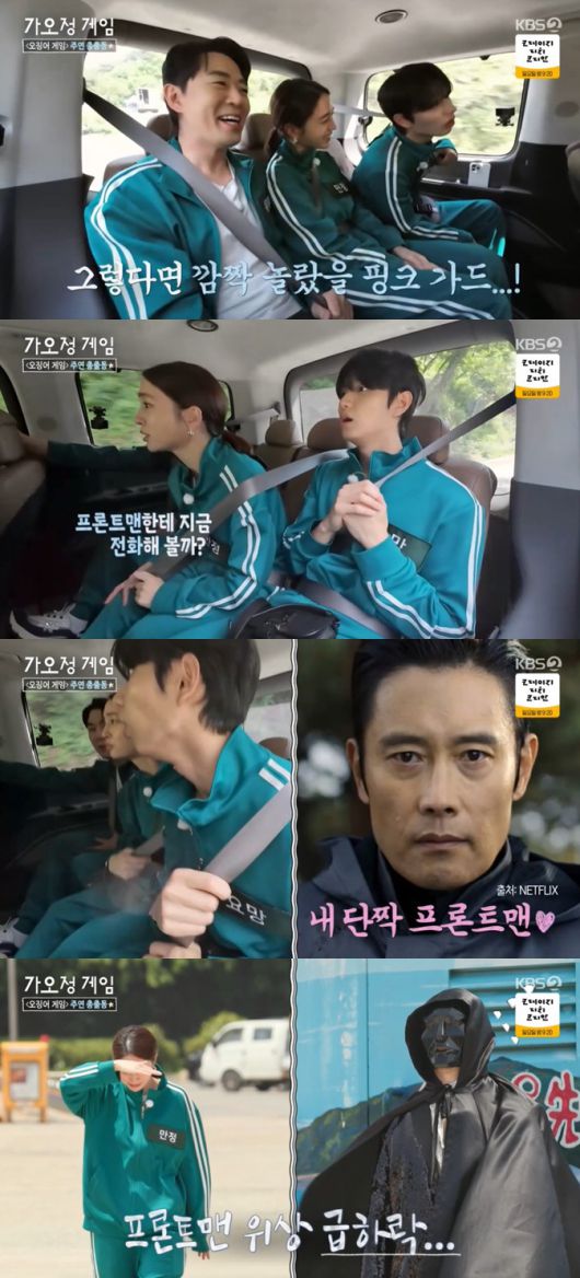 이날 정남매(이민정, 붐, 안재현, 김정현, 김재원)는 각자 닉네임이 적힌 초록색 트레이닝복을 받은 후 '오징어 게임' 속 프론트맨과 핑크 가드 복장을 한 의문의 사람들에게 연행됐다.