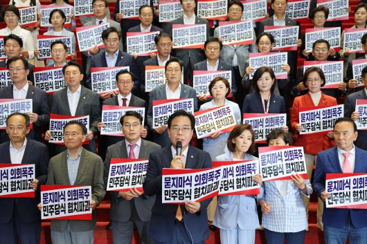 국민의힘은 “이 대통령과 여당이 말로만 협치를 말하고 있다”며 반발했다. 송언석 국민의힘 원내대표는 “민주당의 정치는 정치가 아니라 다수당의 횡포, 법의 지배가 아니라 힘의 지배”라고 했다.